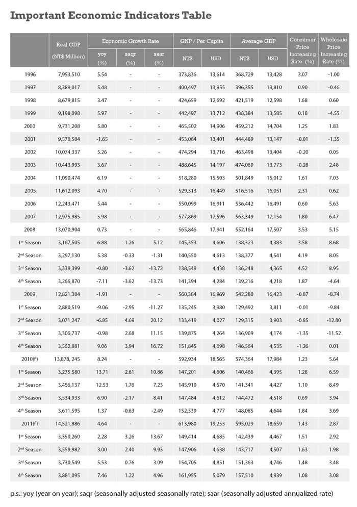 From the aspect of production, after going through the global financial crisis in 2008, the world economy has showed signs of recovering from the sluggish economies. In 2010, it is more certain that the industries have been gradually growing. Surely Taiwan's economy is not exceptional. On August 19th, 2010, the Directorate-General of Budget, Accounting and Statistics publicized the information related to the 2nd quarter national income first statistics, 2010 & 2011 estimated economic growth rates, 2009 household revenue-and-expenditure survey and statistics. Based on the said reports, the 1st quarter economic growth rate was altered from 13.27% (the 1st estimated figure) to 13.71%; as initially estimated, the 2nd quarter growth rate was 12.53%. Compared with that of May, it was 4.87% higher. After the seasonable adjustment, the quarter increased of the growth rate was 1.75%, that is, the annual growth rate is 7.23%. As estimated, the 3rd and 4th growth rates were 6.90% and 1.37%, that is, the annual growth rate is 8.24%. CPI is rising 1.23%, GNP is 13,723.7 billion dollars (429.7 billion USD). Averagely the Gross National Production (GNP) per capita is 14,255.6 billion dollars, which is 447 billion USD. Averagely, GNP per capita is 19,253 USD. From September 14th, 2010 onwards, Taiwan and China signed Economic Cooperation Framework Agreement (ECFA). Taiwanese will be entitled to obtain lower-duty privileges in importing many raw materials and the cost will be greatly cut down. Therefore many entrepreneurs anticipate that until the end of next year Taiwan's production shall be increasing and there shall be considerable profits.