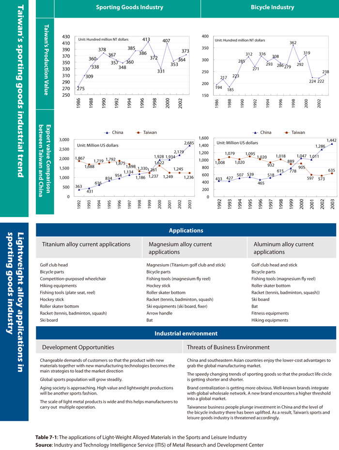Supposed that enhancing R&D capability and building up a brand name are the better development strategy, the sports manufacturers could use Taiwan's lightweight alloy technology as the base and adopt the horizontal and vertical directions to upgrade the industry. On the horizontal development, the sporting goods manufacturers, apart from its continuation to enhance manufacturing technology and skills, can also use this material to other items of sports and leisure equipments or products. Take titanium as an example, the production line of titanium-made golf club head are established in Taiwan. If the lightweight alloy could be applied to bicycle parts (frame, post, pedals, gear), competition-purposed wheelchair (for marathon, for tennis games, for basketball games and for skiing games), hiking equipments (hiking claw, hiking spade, iron spade, titanium tent spade, fire-making and cooking equipments, knifes, forks and spoons), hockey sticks, masks, roller skate bottom, etc. even guide of the fishing equipments, magnesium fly reel, plate seat, embolus at the end of a fishing pole, fishing pole holder, and so on. As shown in Table 7-7, we are able to solidify Taiwan's manufacturing position in the global titanium alloy sports and leisure goods.