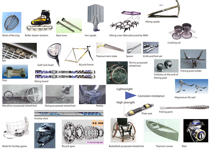 Viewing the development of Al-Sc alloy material, we know titanium is lightweight, high strength ratio, excellent corrosion resistance, not magnetic, not poisonous, high and low temperatures resistance, high anti-damping, low modulus of elasticity, low thermal conductivity, etc. Thus in the early times, it was mainly for military use and aerospace purposes. In the recent years, because the material melting and machining technologies has become mature, titanium has been used in the materials of sports and leisure equipments. In addition to the lightweight property, titanium has high strength ratio and corrosion resistance. They are the main reasons which manufacturers are motivated to use titanium alloyed materials for greater potential market. With the consideration of high strength ratio and lightweight properties, titanium-made golf club heads has been leading the global trend. Its production has been crowned as the champion among titanium-made sports and leisure equipments. Due to the use of titanium alloyed materials, the design of wooden club head has become thinner and larger. Apart from the golf club head, the parts of bicycles (frame, post, pedals, gear), competition-purposed wheelchair (for marathon, for tennis games, for basketball games and for skiing games), hiking equipments (hiking claw, hiking spade, iron spade, titanium tent spade, fire-making and cooking equipments, knifes, forks and spoons), hockey sticks, masks, roller skate bottom, etc. As shown in Table 7-2, because of the demand of high strength and lightweight, titanium alloyed materials are gradually applied. In addition to the mentioned properties of high strength and lightweight, titanium has such excellent corrosion resistance that guide of the fishing equipments, spool reel roller cover, plate seat, embolus at the end of a fishing pole, fishing pole holder, and others are all commercialized. Even we can find some of ship shield or cover is made of titanium alloyed materials.