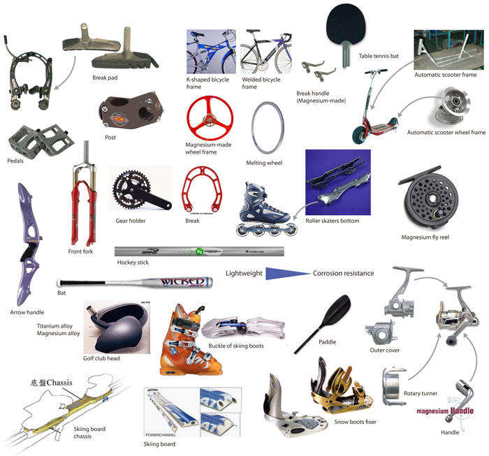 Magnesium alloy among light metals is the lightest metal. During the recent years, it has become one of the major applied materials in the sports and leisure industry. Especially among bike parts, the production of front fork, pedals, frame, post, breaking equipments, wheel, or gear plate are under the developing process of magnesium alloy. And most of front forks are already made of magnesium alloy among the sports and leisure equipments. In addition to bike parts, the recent applications of magnesium-made sports equipments include the bottom of roller skaters, hockey stick, baseball bat, arrow handle, golf ball, snow board, snow board bottom, belt hooks of ski boots, snow boots bindings, row paddle stick, automatic board frame and wheel, etc, as shown in Table 7-3. Though magnesium alloyed materials has lightweight property, it has not enough corrosion resistance. Domestic and foreign manufacturers actively improve the technology to better the surface so that among current fishing equipments, magnesium fly reel, rotary turner, and handles and many other fishing parts start to be produced with magnesium alloy.