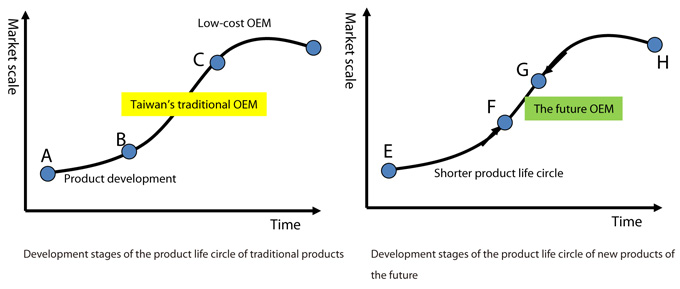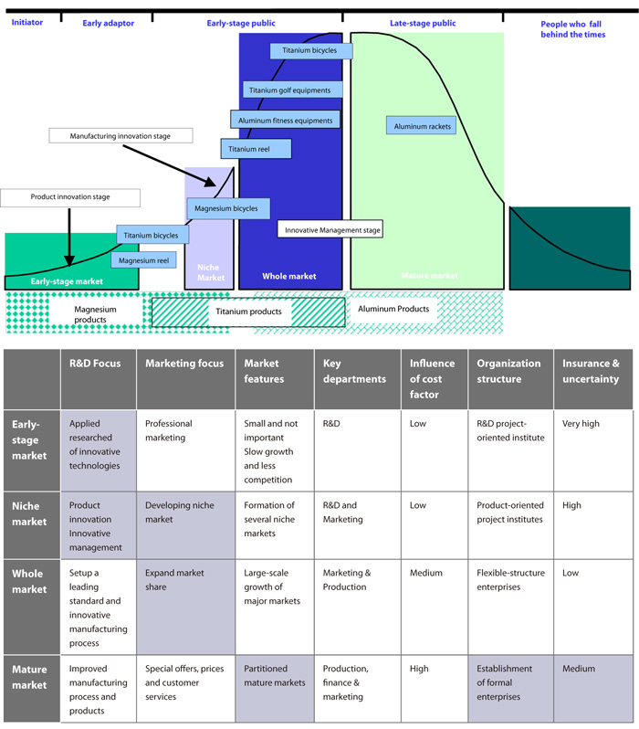 As to the magnesium-made sports and leisure equipments, under the investment of R&D in magnesium-made bicycles over the past decade, now we can see considerable achievement that the said bicycles have been put into commercialized production. Supposed the product shall be positioned on the stage of "Niche Market." The direction of its future development shall be put on marketing part so as to enter the stage of "Whole Market." As to the part of magnesium-made reel cover, it is still on the stage of "Early Market." The R&D is still the main part of the product development. Overall, Taiwan's magnesium-made sports and leisure equipments are on the stage of "Product Innovation" of technological innovation. Production development is the major part of the strategic development, such as the cooperatively-developed bicycle parts made of magnesium. On this stage, it is more important to develop the products which meet market demands so as to enable the product to step into the stage of growth period.