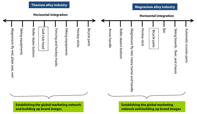 In the aspect of titanium alloy sports and leisure equipments, titanium-made golf club head has advanced itself from "Niche Market" to "Whole Market." Thus the current trading companies adopt the method of massive marketing and low production cost. As to titanium-made bicycles, because the manufacturing is not easy, titanium is mainly used for the production of high-end bicycle models. Undoubtedly, the product still remains on the stage of "Early Stage Market" and "Niche Market." From the perspective of technological innovation, Taiwan's titanium-made sporting goods have entered the stage of "Manufacturing Innovation" so the capability of mass production is the point of strategic development. With a view of the development direction, Taiwanese titanium-made sports and leisure goods manufacturers adopt the method of increasing production lines to uplift OEM/ODM manufacturing capability.
