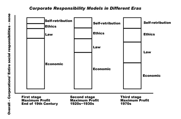 A corporation's social responsibilities have four aspects (Tsai, 1988): economicresponsibilities, legal responsibilities, ethical responsibilities, and discretionary responsibilities (Figure 1). This shows that the social responsibilities that the public asks corporations to fulfill have gradually been shifted from the economic responsibility of providing jobs to the ethical responsibility that is related to the environment and the discretionary responsibility of being willing to fulfill them. The strategic goals of corporate