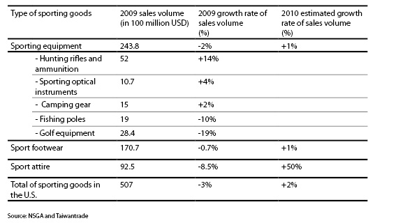 According to the "Report on the Sporting Goods Market 2010" by the National Sporting Goods Association (NSGA), the sales volume of sporting goods in the U.S. (including shoes, clothing, and equipment) was 50.7 billion USD after a drop of 1% in 2008 and 3% in 2009. Of the sporting goods whose sales volume exceeded 1 billion USD, the sales of hunting rifles and ammunition increased significantly by 14%, and those of optical instruments and camping equipment increased respectively 4% and 2%, whereas the sales volume of fishing poles and golf equipment showed a double-digit drop (10% and 19% respectively). Despite the overall drop in 2009, the Report indicates the sales volume is expected to increase by 2% in 2010 and reach 51.5 billion USD, with the volume of sporting equipment and footwear to slightly increase by 1% and that of sport attire to drastically increase by 50%. The market is expected to grow significantly in 2010.