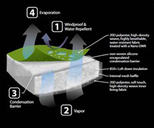 Down has always been the top material for insulated sleeping bags, yet its performance is hindered if it gets wet. The 3D Nanoshell is the latest technology introduced by Sea to Summit to control the dampness of the sleeping bag. The system incorporating a breathable layer, waterproof layer, synthetic silicon fiber, and down effectively keeps external moisture out while allowing perspiration from the human body or down itself escape, keeping the sleeping bag dry and at its optimal performance. (Source: www.seatosummit.com) http://www.seatosummit.com/ |